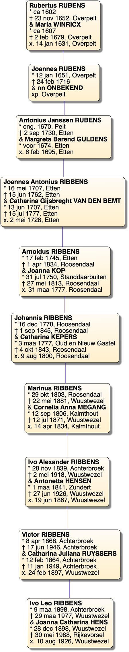 • Bovendien bepaalt de archiefwet dat bv. geboorteakten pas na 100 jaar mogen ingezien worden. Daardoor is informatie over levende personen moeilijk te verzamelen. Toch bevat onze database ook de meesten van de huidige generaties Ribbens. Op eenvoudige vraag sturen wij u een document met uw beknopte stamreeks (voorbeeld hiernaast) of een meer uitgebreide (voorbeeld hieronder).